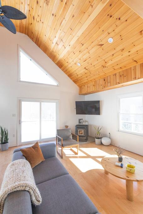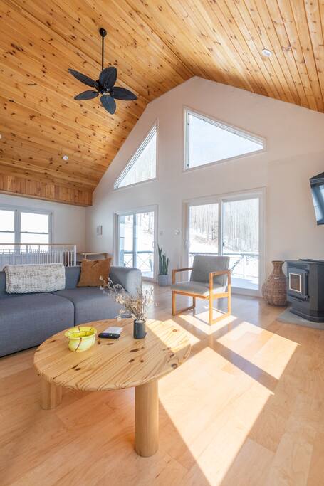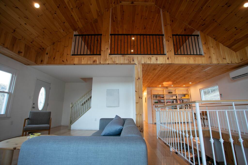 1st fl living room has a wood-burning fireplace. The open mezzanine extends full height to the roof for a connected and communal experience.